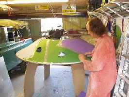 The bow planing surface was difficult - due to the size of the panel (it only just fitted into a 2m x 1m sheet) and the complicated shape that was needed. I decided to cut out a cardboard template to get the shape right, then transfer this shape onto a sheet of aluminium. The card was not well supported by the aluminium frame and this was tricky, but it did give a reasonable pattern. I cut out the bow section panel with the jigsaw, fitted it to the frame, and then trimmed it in-situ to give the 1 or 2mm accuracy needed at the edges, where they butt up to the ends of the side planing panels.More welding