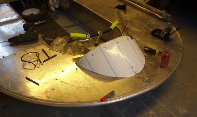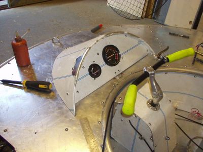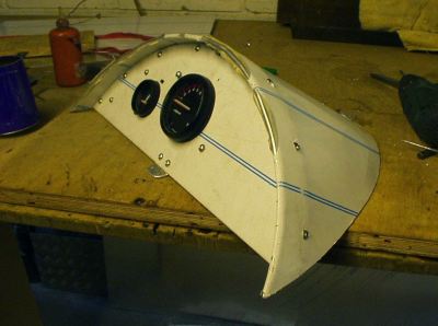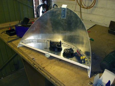 Using some 1.5mm sheet aluminium, I cut out an instrument panel to hold the rev counter and added a length of half inch aluminium angle around the edge to attach it to the cover. This was a semicircle(ish) which I folded the edge over to stiffen it up. I added a couple of brackets so that I could screw the pod onto the (thick) T-section which supported the bow deck.
