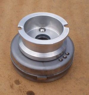As most of the contents of the engine/gearbox case had been stripped, the kick start no longer worked so I needed to fit a starter cup for a pull start - as used on small lawn mowers the world over.As this is going to be spinning at 10,000 rpm it had to be made accurately so that it was balanced. In particular the fixing holes needed to be equally spaced on their PCD. I had bought one from K&M and this looked well made, but it also looked like it needed fixing to a sloping surface on the flywheel, and drilling an accurate hole onto a sloping surface sounded tricky. I needed someone who knew more than a thing or two about drills and stuff. Ron in work came to the rescue and turned up a new starter cup on the lathe that allowed it to be fitted to the flat portion of the flywheel. The three mounting holes were drilled using a dividing head - an old but essential bit of kit. I then screwed the starter cup to the flywheel using a few drops of "studlock" to hold it in place.